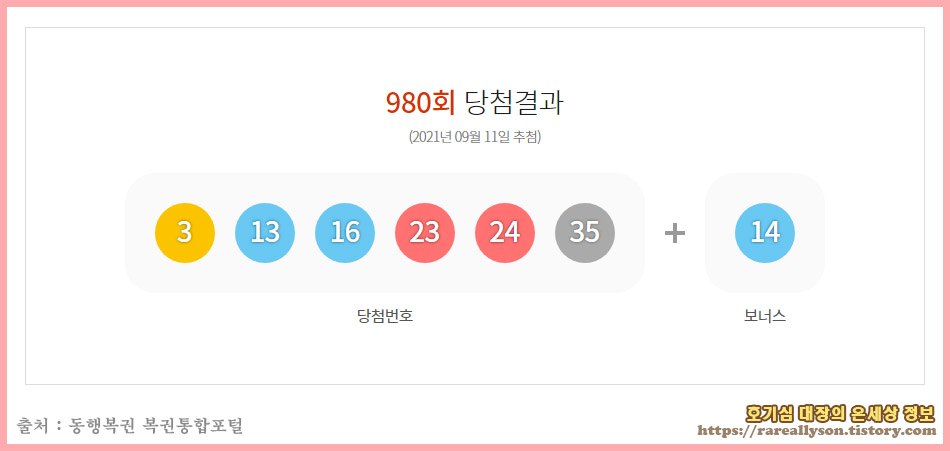 2021년 09월 11일 (토) 추첨한 제980회 로또당첨번호는 3, 13, 16, 23, 24, 35 + 보너스 번호 14번 이다.