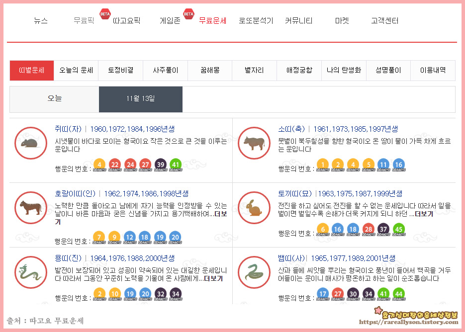 따고요 사이트에서 이번주 로또 예상번호(예상 로또 번호) 를 보는 방법은 두 가지가 있는데요. 무료운세 > 띠별운세에 오늘의운세가 나옵니다. 행운의 번호 6자리가 나오는데, 이 번호를 활용해 보시면 될 것 같습니다.