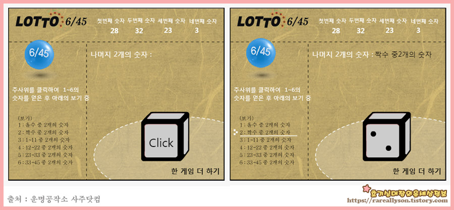 나머지 2개의 숫자는 자동으로 나오는 게 아니라, 본인이 선택하는 방식인데요. 주사위를 클릭하면 나머지 2개 숫자를 선택할 수 있는 범위를 좁혀줍니다.