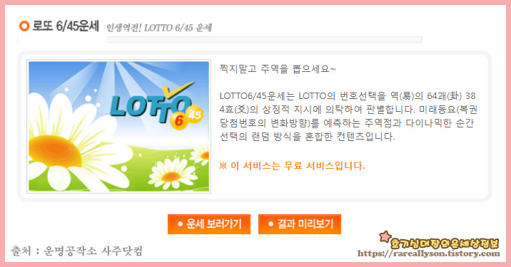 로그인 없이, 회원가입 없이 생년월일과 태어난 시를 입력하여 바로 볼 수 있는 오늘의운세 사이트 6곳을 소개해 드렸었는데요. 이번 시간에는 회원가입 없이, 로그인 없이, 이번주 로또예상번호를 받아볼 수 있는 로또 운세 사이트 3곳을 정리해 봤습니다.
